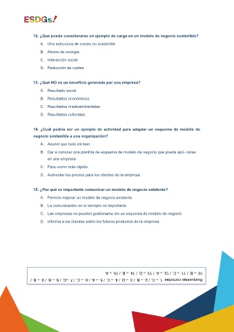 10. – B. / 11. – C. / 12. – A. / 13. – D. / 14. – B. / 15. – A. Resquestas correctas: 1. – C. / 2. – B. / 3. – D. / 4. – C. / 5. – A. / 6. – C. / 7. –C. / 8. – B. / 9. – B. /